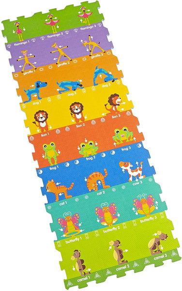 - 24 foam tiles featuring yoga poses that fit together like a puzzle