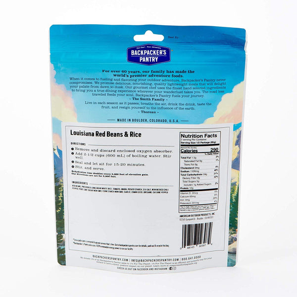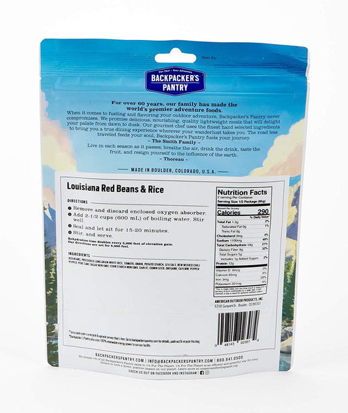 Contains 1 - 6 Ounce Pouch (Packaging May Vary) A true Cajun classic! This simple dish of red beans and rice is tossed with a Creole sauce and a delicious spice of Cajun flar Non GMO, Vegetarian, Vegan & Gluten Free Backpacker's Pantry freeze dried & dehydrated food is made of premium freeze dried meats and produce. Whether you're camping, hiking, backpacking or hunting, take our lightweight & nutritious freeze dried and dehydrated food with you Red beans and rice mixed with Creole sauce makes this entree a high carbo power meal. A true Cajun feast Directions: Add 2-1/2 cups (600ml) of boiling water. Stir well. Seal and let sit for 13 minutes. Stir and serve.