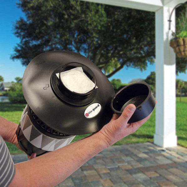 • bite-guard™ CATCHES BITING INSECTS 7 DIFFERENT WAYS: (1) Titanium Dioxide with UV Creates CO2 just like when humans exhale, (2) warmth replicates human heat,(3) Wave Dome interrupts bugs flight path, (4) vacuum creates suction when bugs get near, (5) TacTrap patented adhesive paper, (6) 360° Ultraviolet Bug Light (2 bulbs included) , (7) OneBait™ Mosquito bait