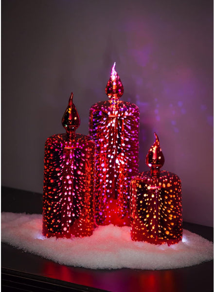 Stylishly illuminate your home with these three red starburst Stargazing LED candles. Inspired by the mystery of the night, the set will bring a celestial aura to any space. Its pattern is laser-etched across multiple layers of metallic film, resulting in an infinite dimensional look and breathtaking display. The candles are outdoor-safe in covered areas and require 3 AA batteries, which are not included.