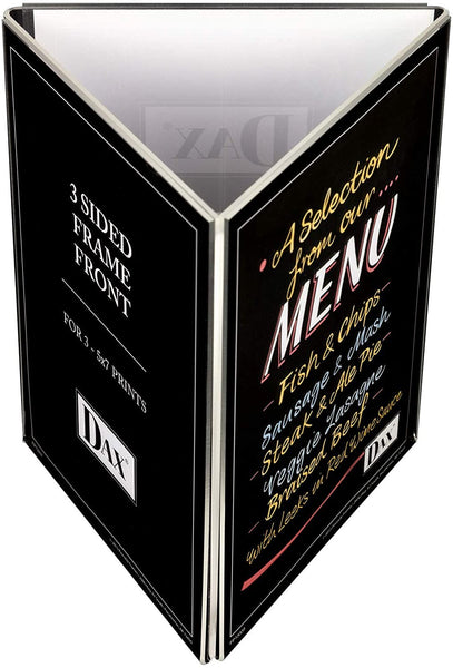 5x7 Acrylic Tri-Fold Table Tent Sign Holder, Three SidedThis Acrylic Tri-Fold Three Sided Table Tent Sign Holder is a simple and affordable solution for displaying menus, promotional signage, 5x7 photos or flyers for events. It's three panel design allows you to display three different signs or photos on any counter or tabletop. Made of clear acrylic, this tabletop display is lightweight and easy to use. Simply lift the frame apart from the bottom and slide old graphics out and replace. The hollow center allows space for condiments or beautiful centerpieces. This table tent is perfect for offices, restaurants, store fronts and events. Use it to display desert menus to customers or hold table numbers at weddings and showers.