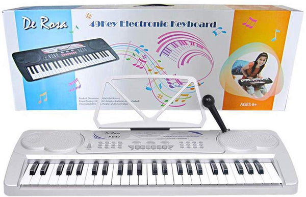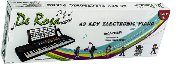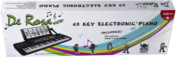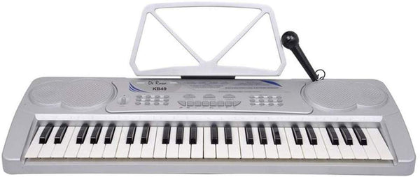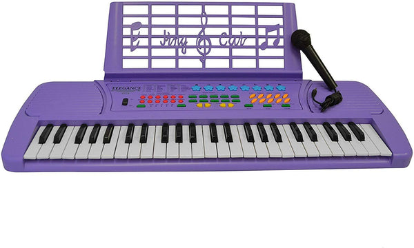 Children 49 Keys Electronic Piano Music Keyboard. This child's keyboard is an easy and fun way for kids to learn how to play the keyboard. Research has proven that children who play an instrument do better in school, build self esteem, and make friends more easily. 49 Accordion size Keys, 8 Timbres, 10 Rhythms, 8 Percussions, 8 Demonstration Songs, 25 Speed Adjustable Tempo, Chord / Vibrato / Sustain / Fill in Bass, Auto Bass Chord Function / Single Finger and Fingered, Chords Large Scale Integration / Matrix Controlling, Dimensions: 34" (L) x 14.5" (W) x 5" (H), DC 9V/AC 110V, For Ages 3 –12. Uses batteries (not included) or power connector (Included).