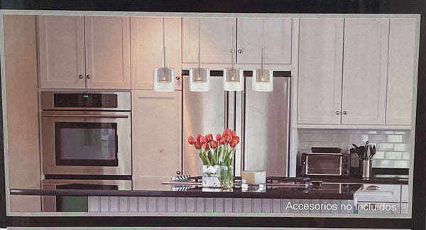 This DSI 4-Light 76.57''H Chrome Pendant has clear glass shades with an aluminum shade interior. All shade heights are adjustable for a perfect fit over your kitchen island or dining room table. Dimensions: 31.89" L x 5.12" W x 76.57" Max Height (This is Adjustable).
