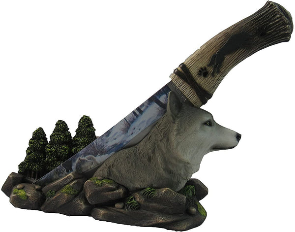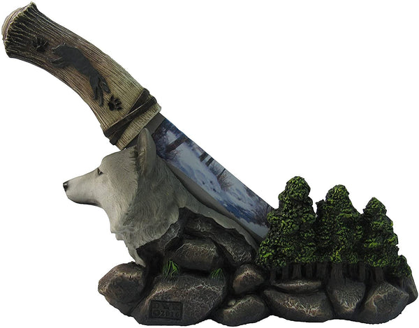 DWK - Wolf Spirit Blade - Rustic Wolf Snowy Mountain Forest Scene Stainless Steel Display Knife with Decorative Figurine Holder Wildlife Nocturnal Cabin Lodge Home Décor Accent, 11-inch