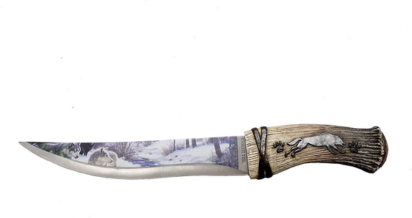 Decorate your cabin or rustic home with this beautifully made display knife dagger on a black bear in the forest. The display knife features gray wolf in forest scenery print. Great centerpiece for any fan of the wild. Stainless steel knife for display purposes only.