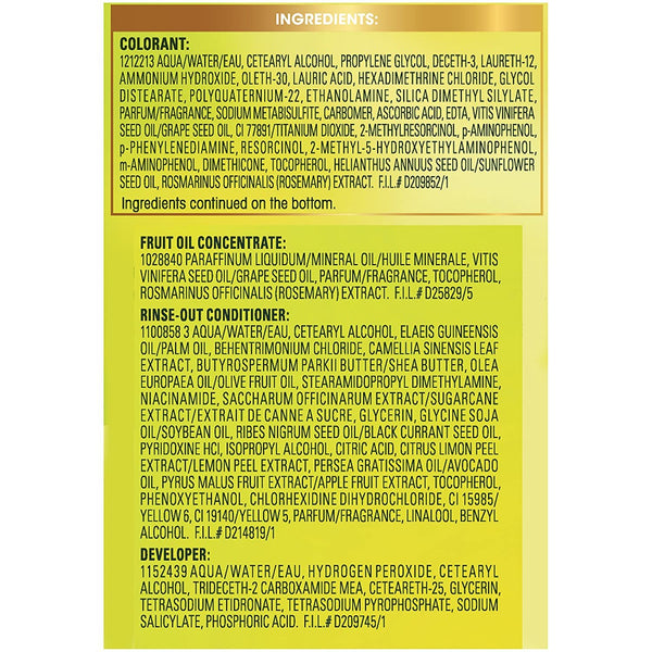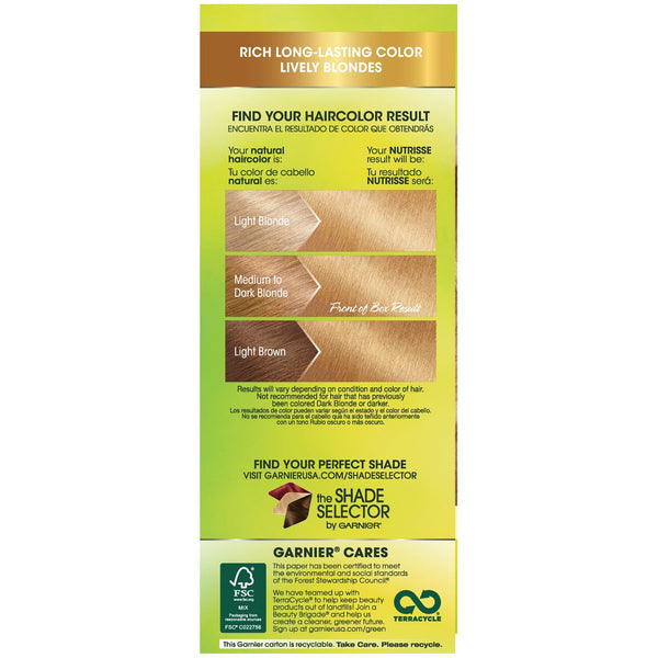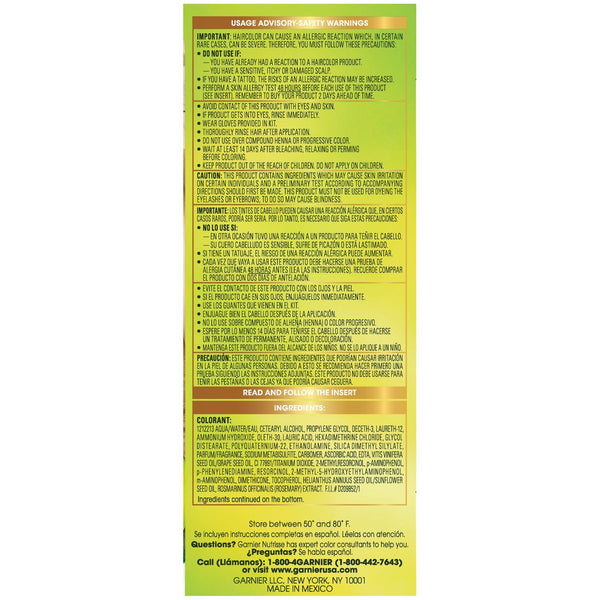 Garnier Nutrisse is the only permanent hair color creme that nourishes while you color with avocado, olive, and shea oils. The nourishing color creme enriched with fruit oil concentrate, penetrates deep into hair fibers to nourish and condition your hair so it takes color better and holds it longer, root-to-tip. Garnier Nutrisse delivers rich, radiant, long-lasting hair color with 100% grey coverage. • Permanent, nourishing hair color creme with three fruit oils- avocado, olive, and shea • The only hair color creme with a separate ampoule of grape seed oil to start nourishing as you color • Rich, radiant, long-lasting color with 100 percent grey coverage • Available in 45 Nourishing Shades Always read the hair color instructions insert in the box. Store between 50° and 80° F. Questions? Garnier Nutrisse has expert color consultants to help you. Call: 1-800-4GARNIER (1-800-442-7643). IMPORTANT: Hair color can cause an allergic reaction. Do not use if you’ve already had a reaction to a hair color product or if scalp is sensitive, itchy or damaged. Tattoos may increase risk of an allergic reaction. Do skin allergy test 48 hours before each use of this product. Don’t use over compound henna or progressive color. Wait at least 14 days after bleach, relaxing or perm before use. Don’t use on children. This is a safety summary. Read all labeling and instructions completely.