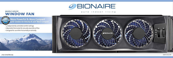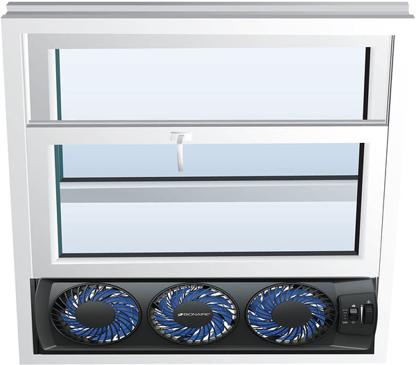Get relief from hot weather and stale air using the Bionaire Thin Window Fan with Digital Thermostat. Designed to fit windows with minimum openings of 25.5 inches by 8.0 inches, this window fan unit uses three independently controlled fans to circulate air and provide efficient cooling. This window circulator fan comes equipped with an easy-to-operate thermostat dial, and it features three speed settings for personalized comfort. The airflow is fully reversible, allowing for intake of fresh cool air, exhaust of hot, stale air, or exchange for full-room circulation. Dual locking extender screens hold the fan rigidly in place, helping ensure a secure fit.