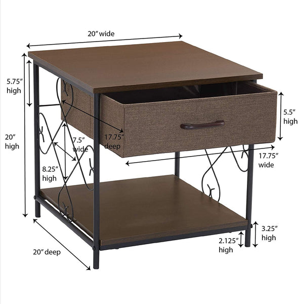 Enjoy this living room classic with HOUSEHOLD ESSENTIALS Victorian End Table with a drawer, a elegant squared coffee table with a full-length open storage shelf. With black metal scroll work on either end, this walnut laminate end table is an understated perfect table. Ideal on the side of a couch or sofa, it gives you a place to decorate your favorite space, work on paperwork. The dark wood tone and black metal give it a timeless finish that does not go out of style. The table is 20 inches high and 20 inches wide x 20 inches deep. It sits most comfortably with chairs and couches whose seats are 22-24 inches high. Assembly required. This end table is part of the Victorian Collection.