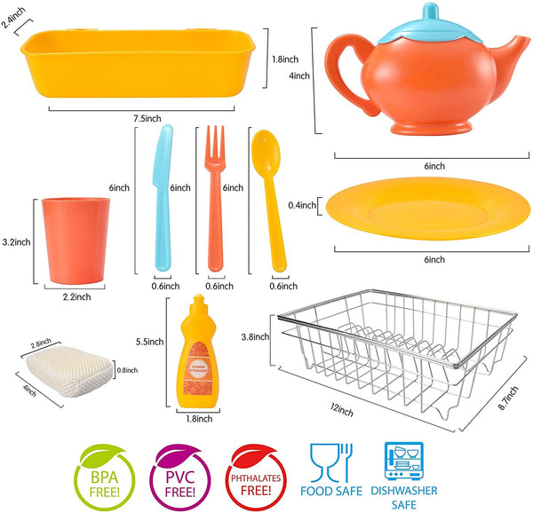 SUPER VALUE with 25 Pcs Pretend Play Dishes Washing Set in 2 Different Color Sets. Including Heavy Duty Dish Drainer, Bowls, Plates, Saucers, Knives, Spoons, Forks, Cups and Detergent.