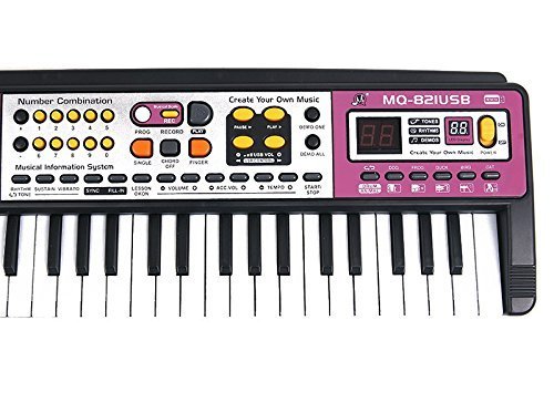 Let's Enjoy Music! This 22" 49 key mini keyboard from MQ is loaded with fun! This musical information system would make the perfect gift for any child 3-12 yrs old. This keyboard comes with many features including: FM Radio, 10 Demo Songs, 5 Percussion, 5 Animal Noises + More!